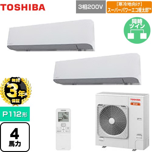 | 仕様・ 特徴 | 外気温-20℃まで定格暖房能力維持、高い省エネ性。 壁掛形 P112形 4馬力相当 同時ツイン 三相200V ワイヤレスリモコン 冷房能力:10.0(3.1~11.2)kW 暖房能力:11.2(2.4~15.6)kW 冷媒:R32 パッケージエアコン オートスイング オートフラップ 風量切替(5段階) タイマー運転 暖房能力(低温):12.2kW(-15℃)、10.8kW(-20℃) |
