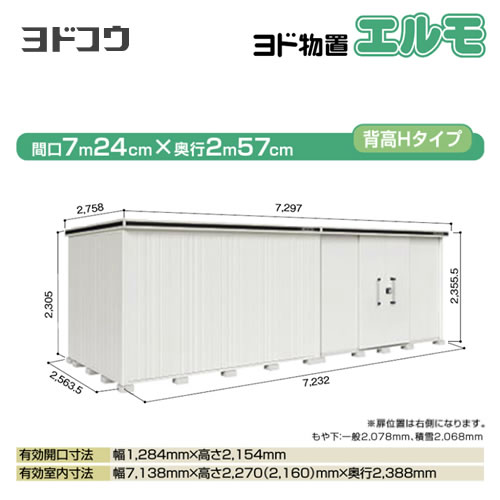 | 仕様・ 特徴 | 屋根タイプ:背高Hタイプ 耐荷重タイプ:積雪型 扉タイプ:引き分け戸(扉位置:右側) 間口7232mm×奥行き2564mm×高さ2356mm 面積18.54m2(5.62坪) 本体重量1040kg 基礎ブロック必要数(別途必要):47 付属品:アンカープレート・転倒防止金具 (※棚板別売) |