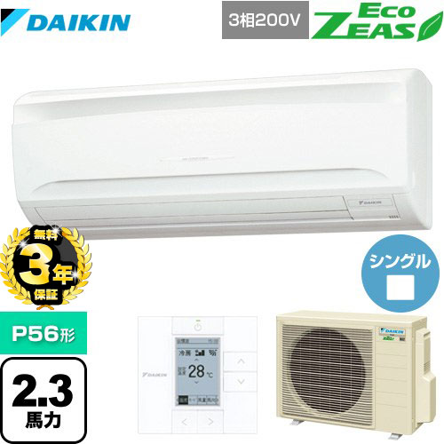 | 仕様・ 特徴 | 店舗・オフィス用エアコン「スカイエア」大容量クラスもラインアップのスタンダードモデル。 壁掛形 P56形 2.3馬力相当 ペア(シングル) 三相200V ワイヤードリモコン 冷房能力:5.0(2.3~5.6)kW 暖房能力:5.6(2.6~7.1)kW 新冷媒R32 |