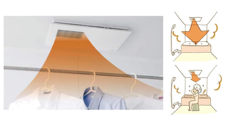 浴室を暖かくも涼しくもできる三乾王。 ヒートショック防止の暖房、雨の日の部屋干しにも強い衣類乾燥、お風呂のジメジメ対策になる換気、夏の蒸し暑さ対策に涼風と、これ1台で4役をこなします。